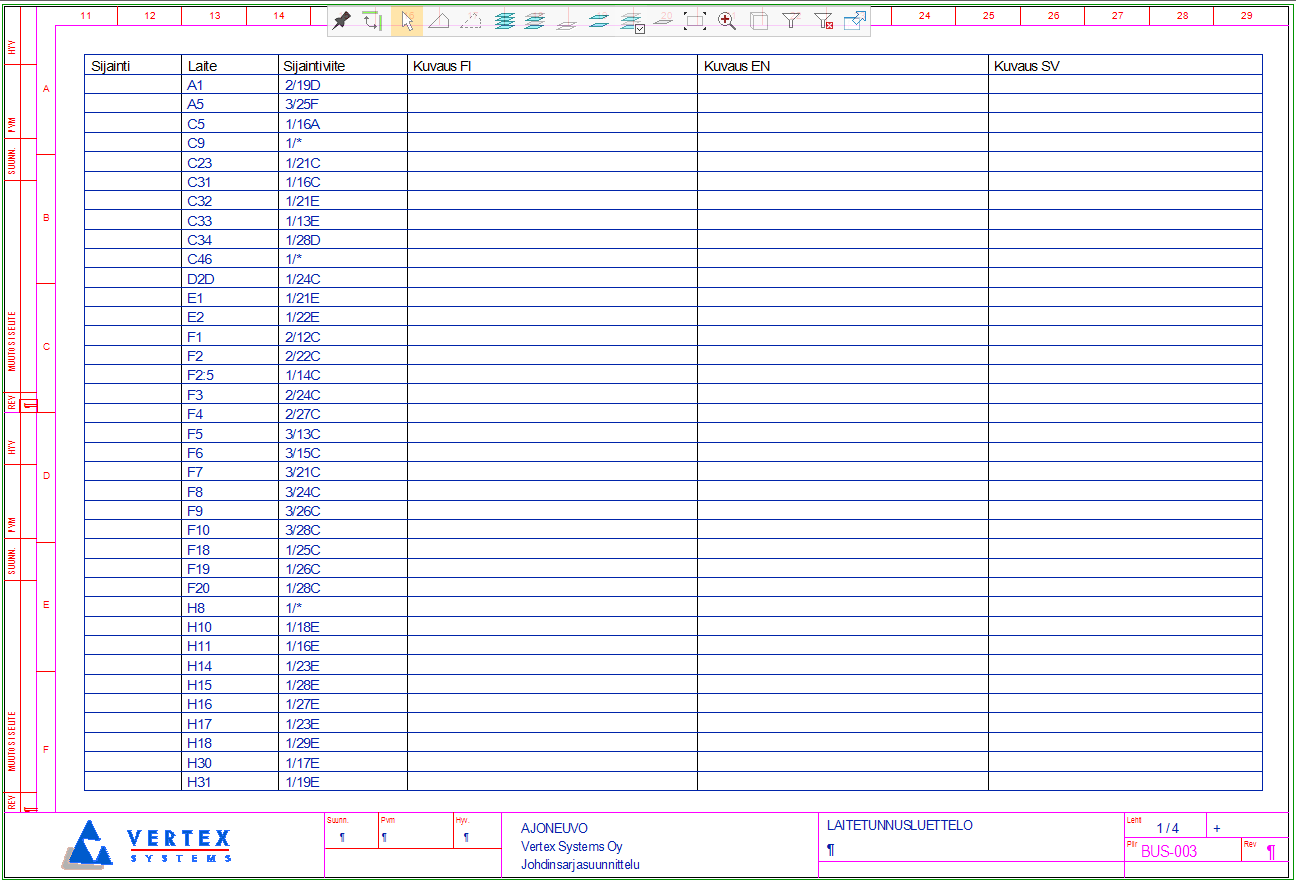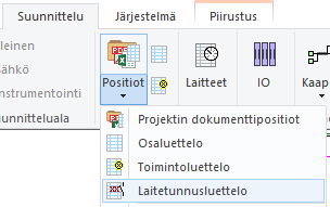 Suunnittelu→ Raportit/Positiot→ Laitetunnusluettelo