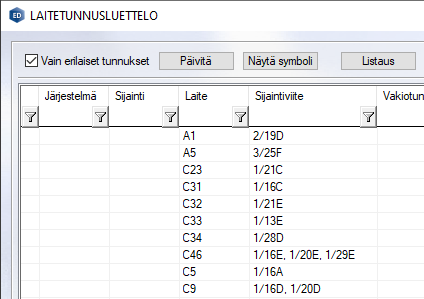 Toiminto kerää kaikki laitetunnukset piirustuksen kaikilta lehdiltä. Valinnalla ”Vain erilaiset tunnukset” valitaan näytetäänkö kaikki tunnukset vai ainoastaan kaikki erilaiset tunnukset. Jos valintaa muutetaan, pitää lista päivittää toiminnolla ”Päivitä”.