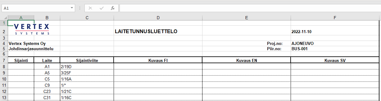 Laitetunnusluettelo piirustuksena tietyille lehtinumeroille, Excelinä tai PDF:nä
