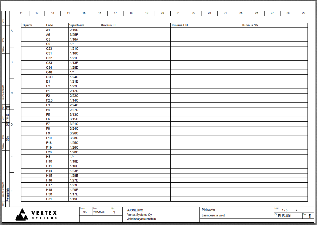VXP- ja PDF-listaukset tehdään omalle piirustuspohjalleen. Lisäksi laitetunnusten Excel-listaukseen lisätään lyhyt viiteluettelo. jos sama laitetunnus toistuu samalla lehdellä on useaan kertaan, tulee sille vain yksi viittaus muodossa: "<sheet>/*" eli esimerkiksi "X1/12, X1/17, X1/18" viite on muotoa "X1/*"