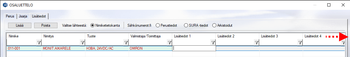 Laitetiedot-dialogiin rakennettiin kolmas sivu "Lisätiedot"/"Aux. data", jonne lisättiin kentät AUX_DATA1...AUX_DATA9. Kentät koskevat pääasiassa Sähkönumeroiden kautta haettavia nimikkeitä ja niiden lisätietoja.