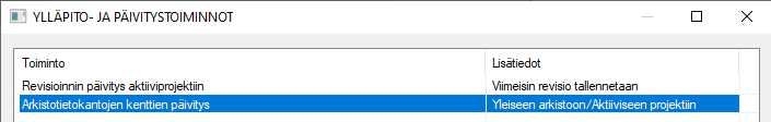 Järjestelmä→Ylläpito→Ylläpito- ja päivitystoiminnot→Arkistotietokantojen kenttien päivitys