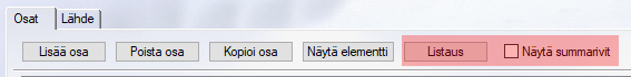 Laitteet-dialogiin lisättiin mahdollisuus tehdä erilaisia listauksia Listaus-napin kautta. Alaosassa (OSATIEDOT) on "Listaus"-nappi, josta aukeaa PARTLIST-tietokannan mukaiset listausvaihtoehdot. Vanhemmissa versiossa esiintyvä "Piilota SUM"-nappi on korvattu "Näytä summarivit" valintaruudulla. Tämä valinta on oletuksena aina pois päältä dialogiin tultaessa. Kun valinta on päällä, summarivien "Lkm keruu" ja "Elementin Id" kentät on merkattu kellertävällä REF-merkkauksella.