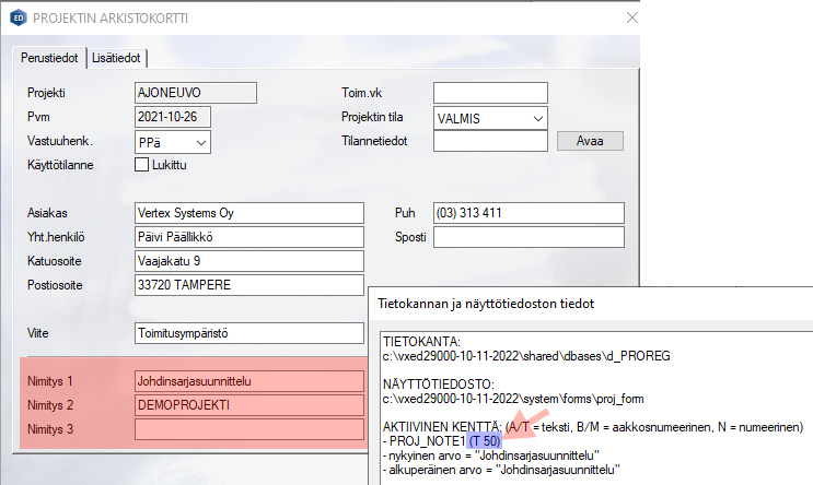 Projektiarkiston nimityskenttien (PROJ_NOTE1, PROJ_NOTE2 ja PROJ_NOTE3) pituudet kasvatettiin 50 merkkiin ja sähköpostikentän pituus 100 merkkiin.