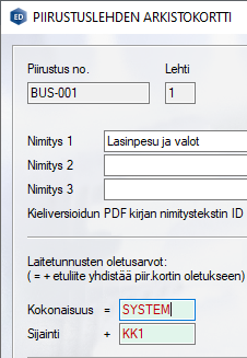 "Laitetunnusten oletusarvot: " alle lisättiin ohjeistus: ( = + etuliite yhdistää piir.kortin oletukseen)