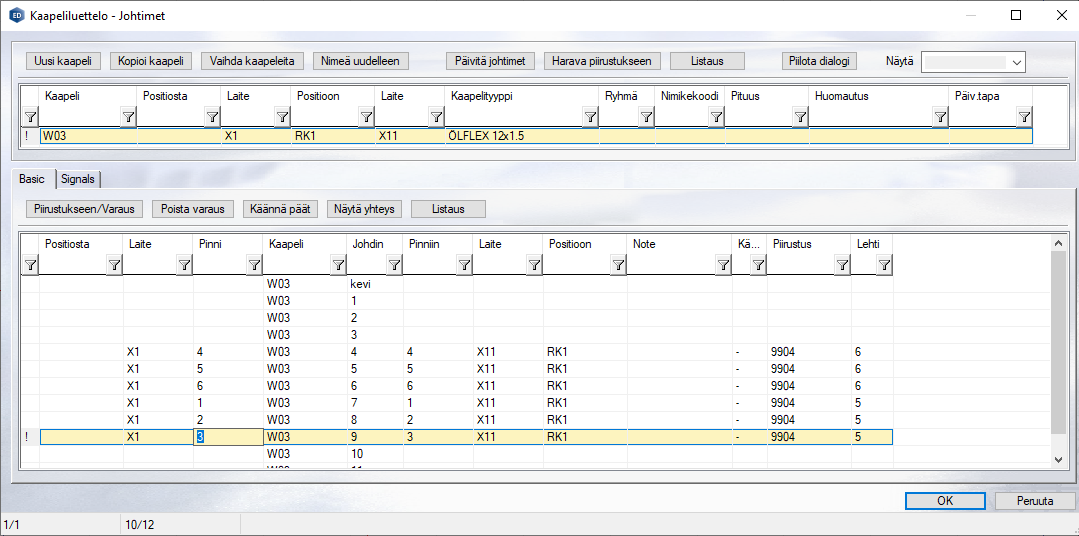 Jos tällä valitulla johtimella on varaus kaapeliluettelossa, liittyvät rivit ovat oletuksena valittuina. Nämä kaapeliluettelon rivit merkataan kellertävällä merkkauksella.