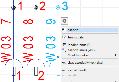 Kaapeliluetteloon päästään ribbon-valikon "Kaapelijohdotus"-toiminnon lisäksi myös valituin johtimen tilavalikon "Kaapelit"-toiminnolla.