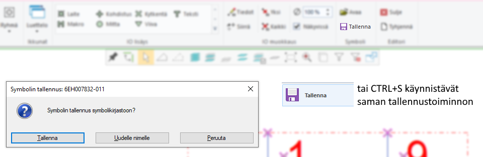 Kun symbolieditori on aktiivinen, ohjelman normaali tallennus (File→Tallenna tai CTRL+S) ohjaa nyt symbolin tallennukseen automaattisesti. Aiemmin käyttäjän piti ymmärtää valita symbolieditorin oma Tallenna-toiminto symbolieditorin välilehdeltä eikä väärin ymmärretty normaalin tallennuksen yrittäminen tuottanut haluttua lopputulosta.