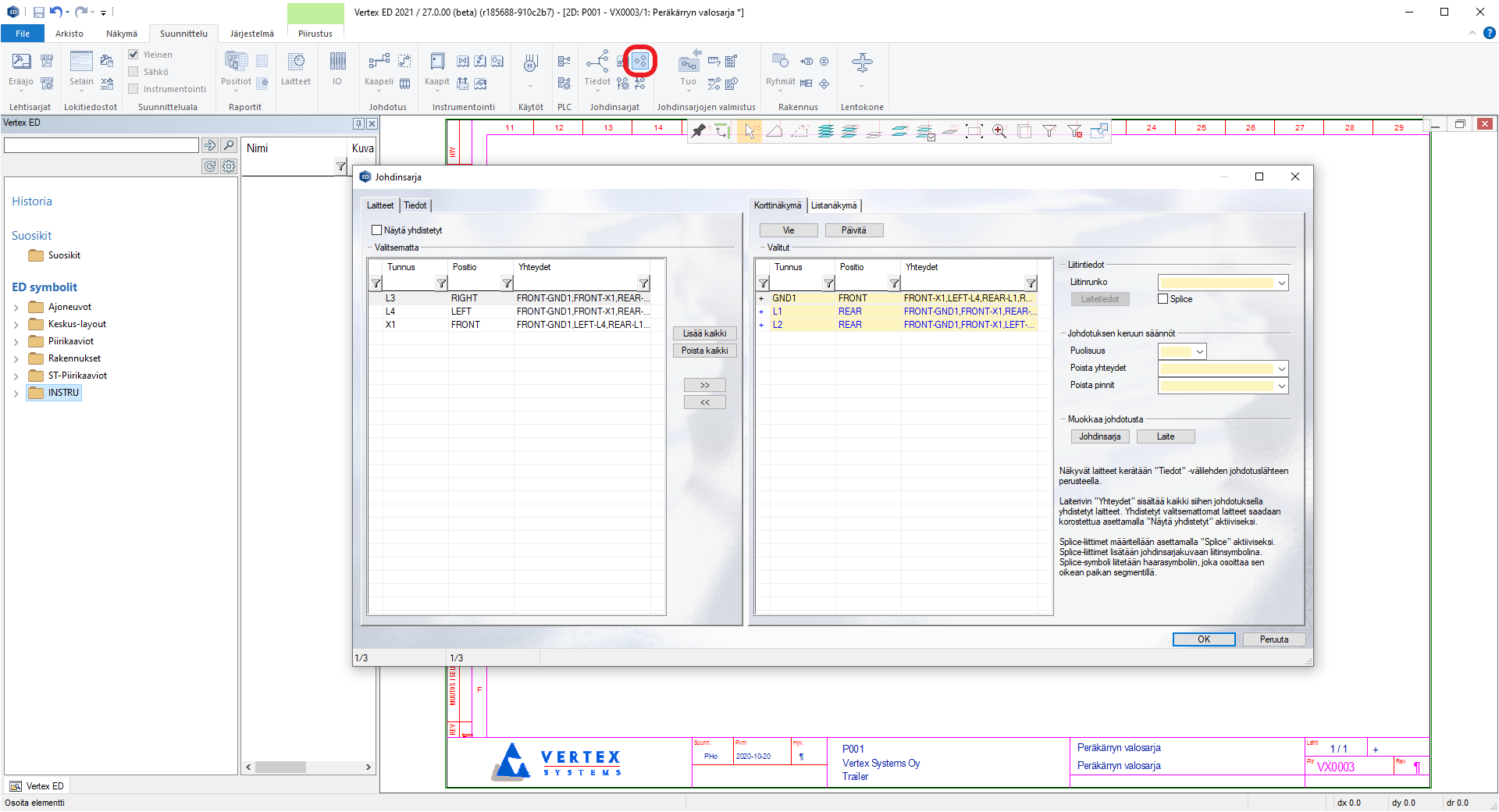 - Liittimet voidaan lisätä browserista sähköosien lisää toiminnoilla tai Johdinsarjan tiedot -toiminnosta.