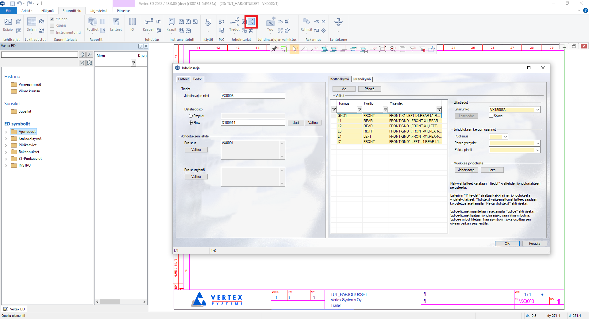 Johdinsarjan exportoitava laite/liitin-luettelo johdotuksineen määritetään kuvan attribuuttitietokantaan "Johdinsarjan laitelista".