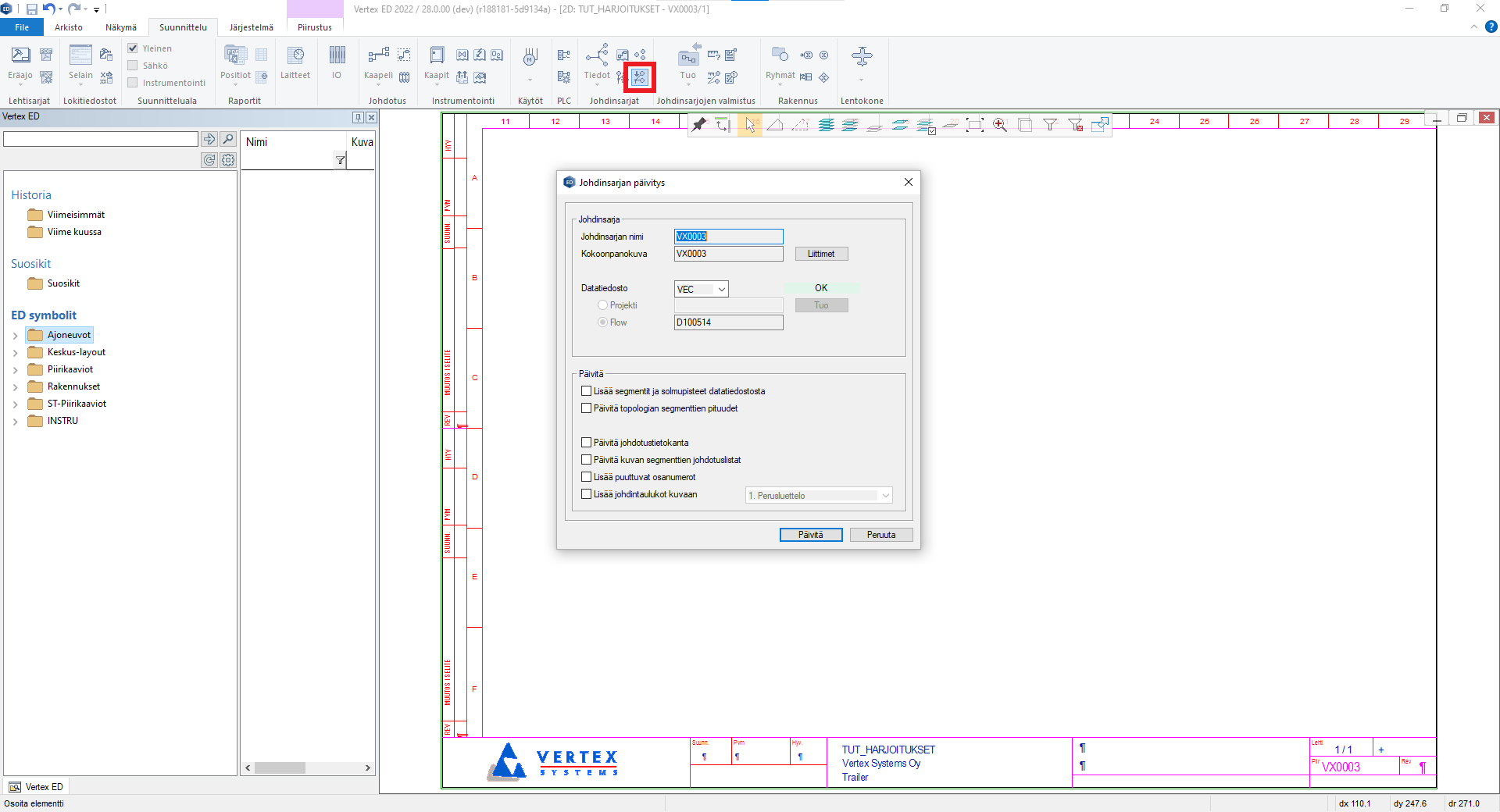 - Johdinsarjan päivitysdialogin Tuo-toiminnolla tuodaan erillinen datatiedosto, joka tallennetaan projektihakemistoon.