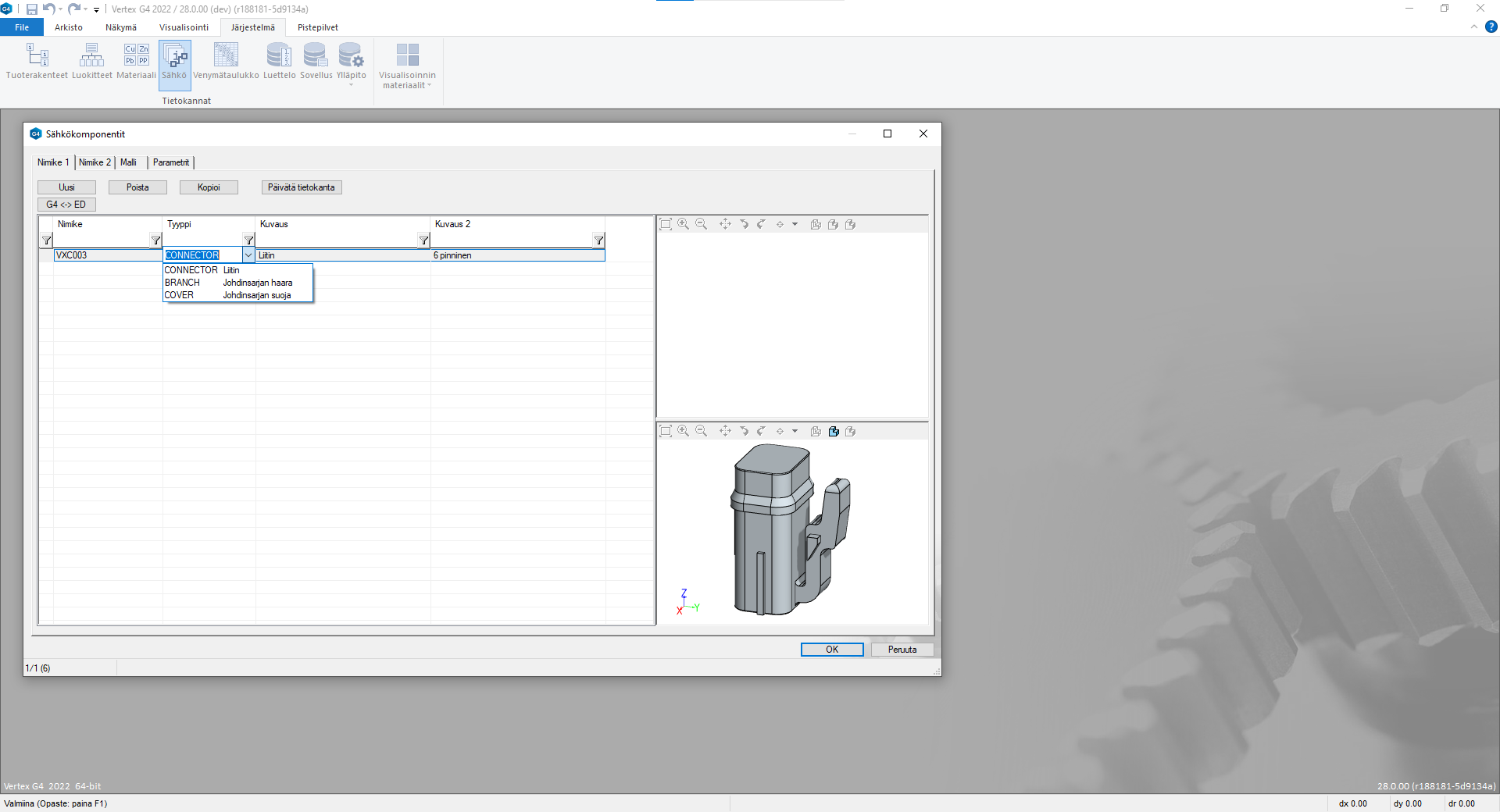 - Sähkökomponentti nimikkeet mallitietoineen lisätään sähkökomponentit-tietokantaan. Tyypiksi asetetaan CONNECTOR.