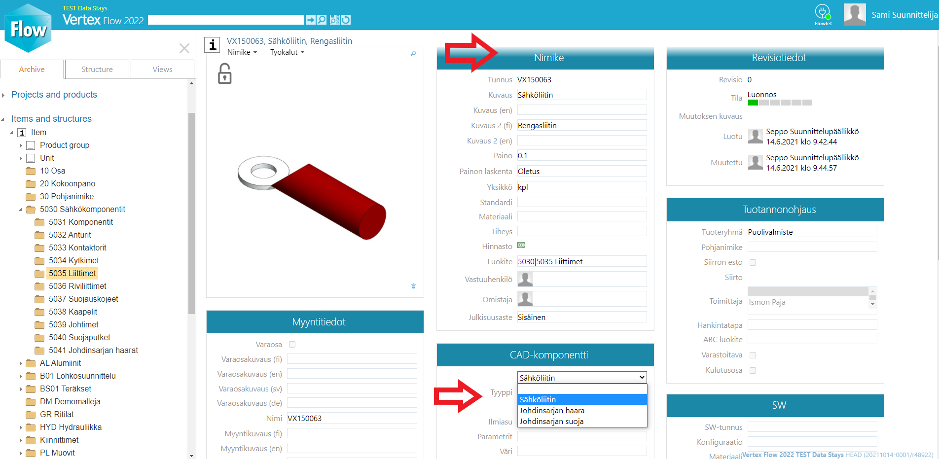 - Flow-nimikkeelle annetaan CAD-komponentti tyyppi "Sähköliitin".