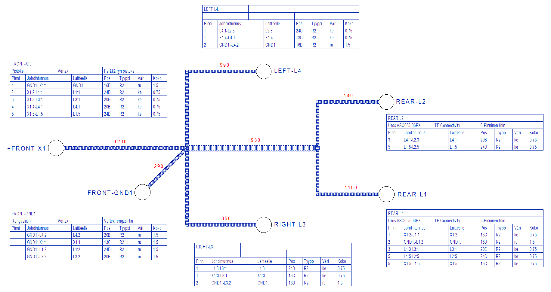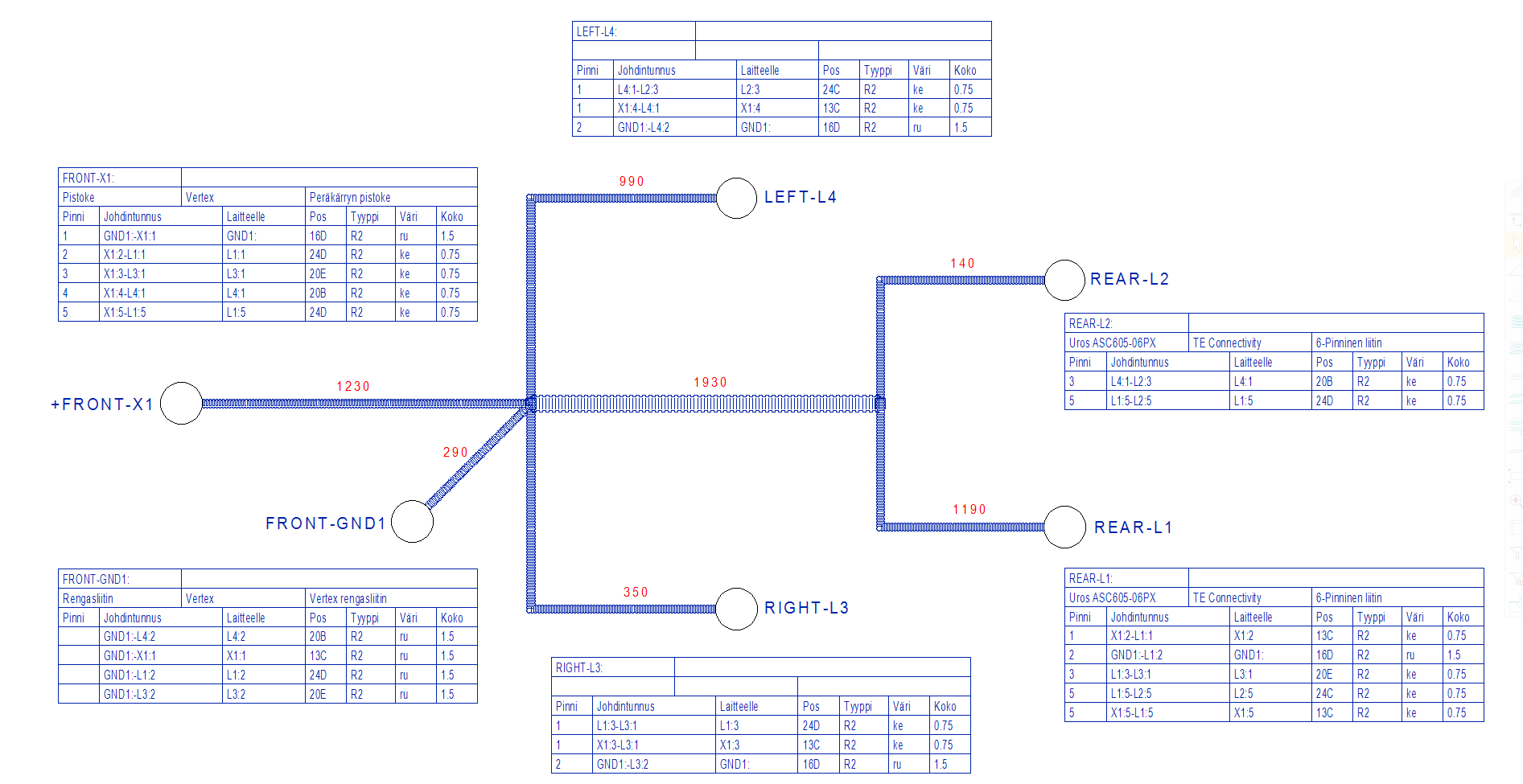 Vertex ED:llä piirretyt piirikaaviot kaikkine lisätietoineen toimivat pohjana Vertex G4:ssä toteutettavalle johdinsarjojen liitinpaikkojen, haarautumispisteiden sekä johdinreittien ja -pituuksien määrittämiselle.