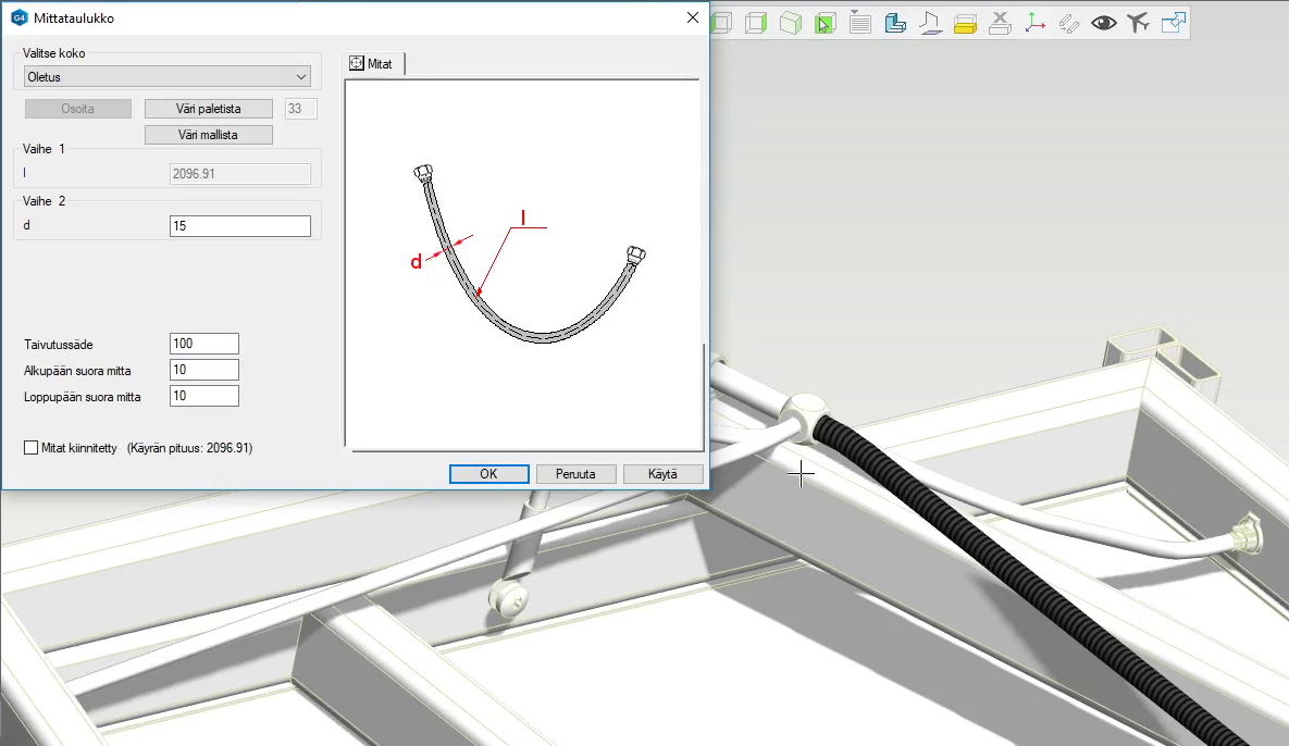 Yhden johdinreitin määrittelyn jälkeen ohjelma antaa johdinreitistä lisätietoja ja antaa mahdollisuuden parametrien muuttamiseen. Esimerkissä johdinsegmentin pituus on noin 2097 mm ja halkaisijaksi (d) on asetettu 15 mm.