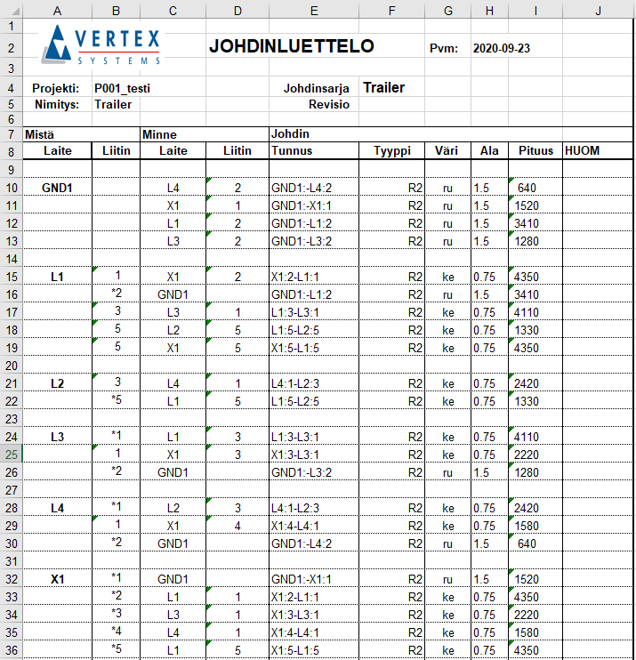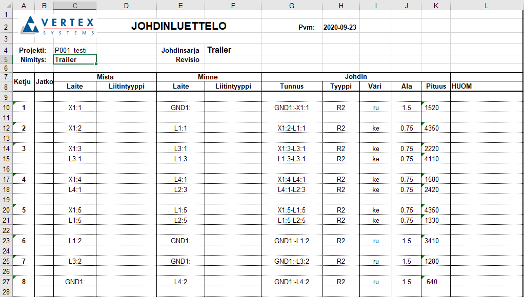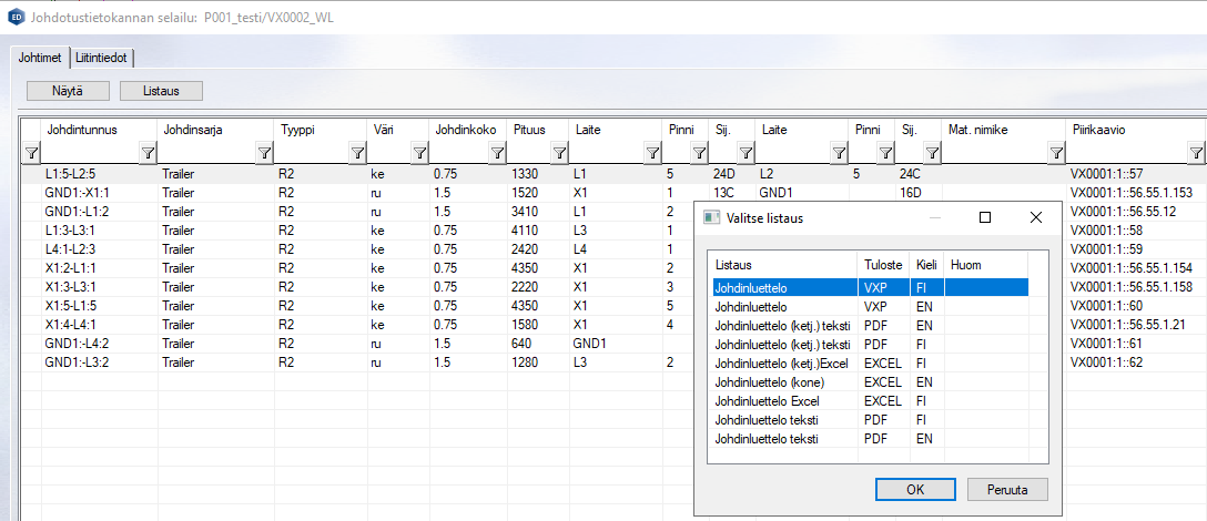 Johdotustietokannasta saadaan jatkojalostettua esimerkiksi johdinluettelot pituustiedoin tai valmiit johdinlistat katkaisukoneita varten.