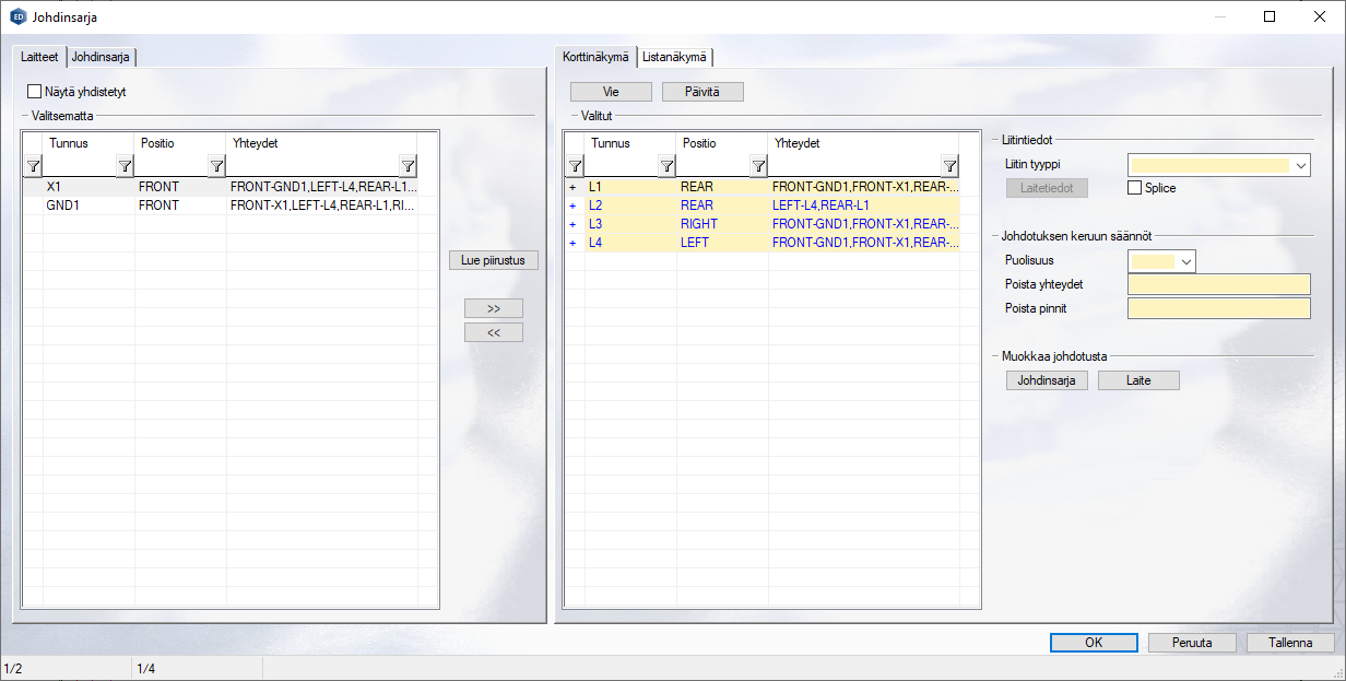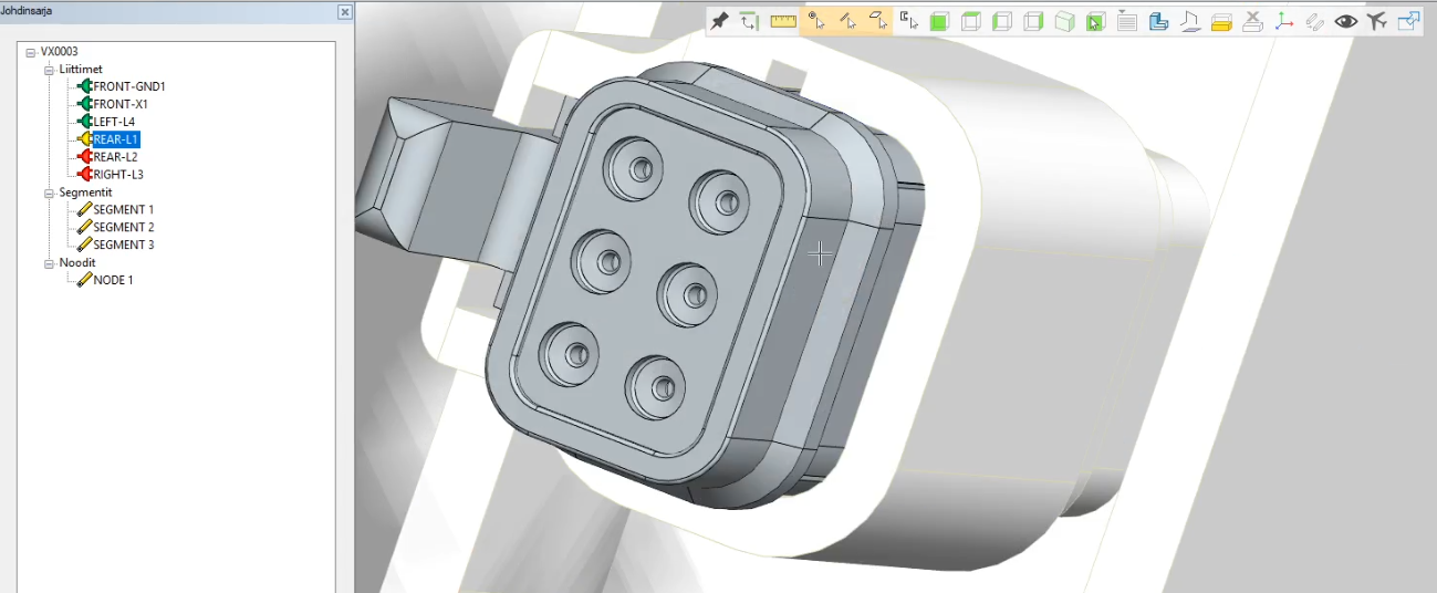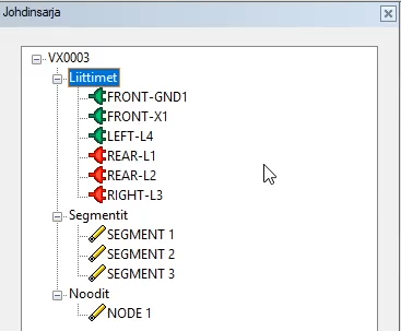 Vertex ED:stä johdinsarjan piirikaavion perusteella on kerätty johdotus ja johdinsarjan rakenne, joka on tuotu Vertex G4:ään. Valitaan 3D-malliin lisättävät liittimet, segmentit (johdinreitit) ja noodit (haarautumispisteet tai haarakappaleet).