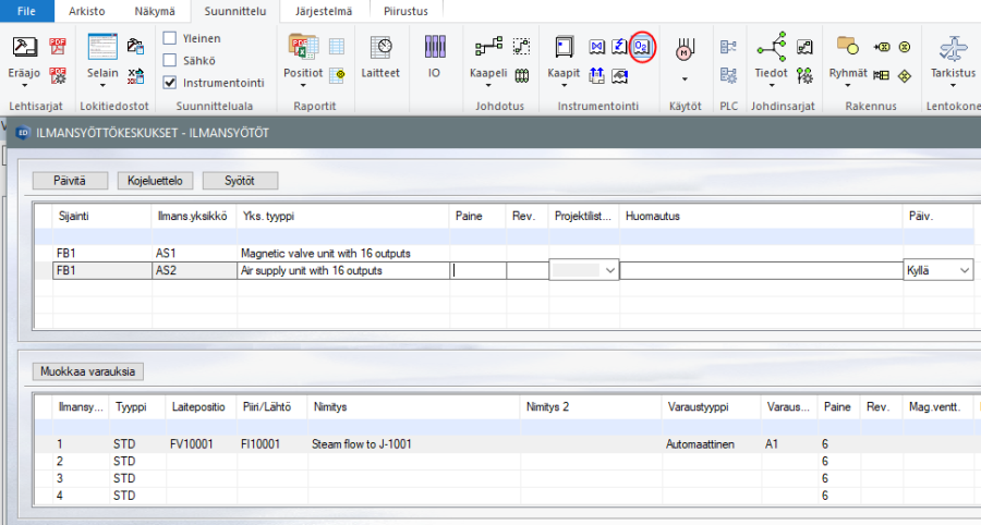 Ilmansyöttöyksiköt ja ilmansyötöt luettelossa näkyvät järjestelmään esitellyt ilmansyötöt ja missä piireissä ne ovat käytössä. Listaa päivitetään laitetiedoista.