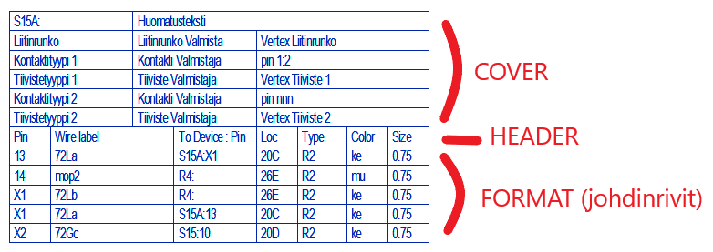 HUOM! harn_dtable_fmt-formaatissa ei voi antaa liitinrivejä kommenttiparametreina vaan COVER-osion parametrit voi antaa vain formaattitiedostoille "harn_wtab_fmt_n.fmt", jossa n on 2, 3, 4 tai 5.