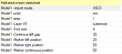 Katkaisukoneen asetuksiin käyttäjä voi kirjata käyttämänsä katkaisukoneen parametreja hyödynnettäväksi johdinsarjan tuotantovaiheessa.