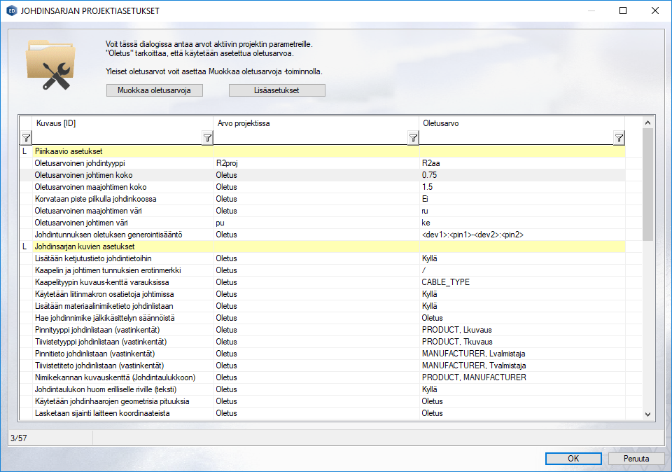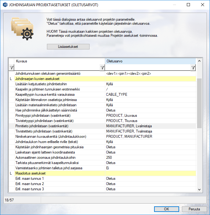 Käyttäjän on myös mahdollista siirtyä muokkaamaan Johdinsarjan projektiasetusten oletusarvoja valitsemalla Muokkaa oletusarvoja. Lisäasetukset -valinnan kautta käyttäjän on mahdollista lisätä yleisiä parametreja projektiensa taustalle.