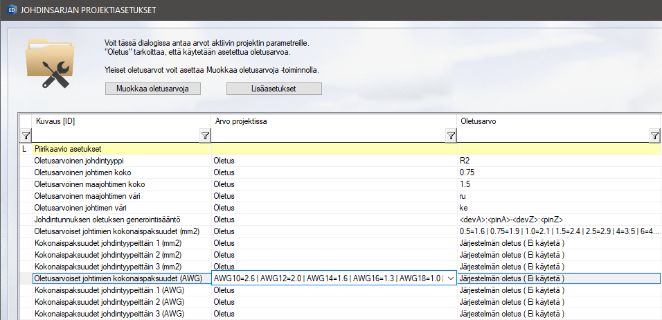 Johdinsarjan projektiasetuksiin lisättiin omat asetusarvot johdinten AWG-koille vastaavasti kuin mm2. Johtimien koko tulkitaan niin, että jos johdinkoko alkaa tekstillä “AWG” tai “awg” on kyseessä AWG-kokoarvo ja silloin käytetään sen halkaisijan määrityksessä AWG-kokojen asetusarvoa. Esim. johtimelle annetaan johdinkoko “AWG10”. VXED-297