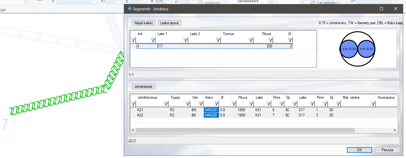 Asetuksiin määriteltyjä AWG-kokojen paksuusvastaavuuksia käytetään johdinsarjan layoutin segmentin johdotuksen paksuuden laskennassa