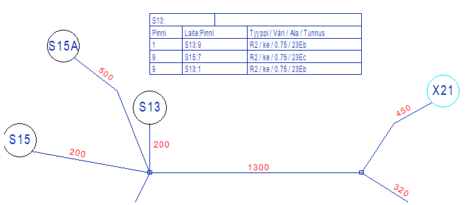 - Erikoistapauksena voidaan johdinsarjakuvan reittiviivojen laitetiedoissa antaa lukumääräksi L-/+<erotus>, jolla voidaan esimerkiksi suojaputken pituus antaa suhteessa johdinhaaran pituuteen (L-100 tarkoittaisi kaapelitunnuksena annettu pituus - 100 mm).