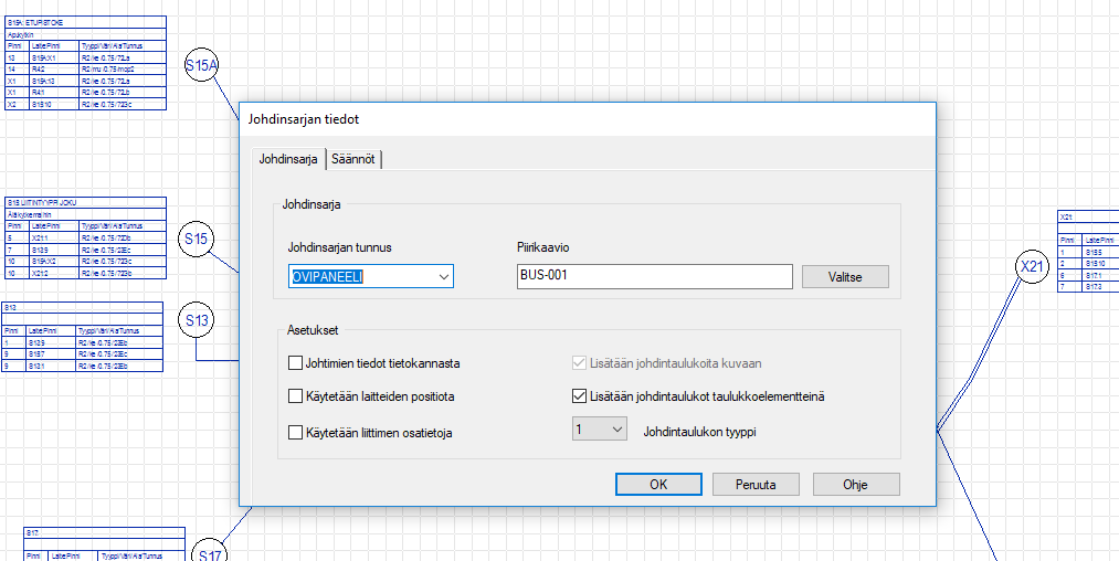 Jos asetuksissa valitaan Lisätään johdintaulukoita kuvaan lisätään/päivitetään johdinsarjakuvan johdintaulukoita, joissa esitetään kullekin laitteelle tulevat johtimet. Taulukoiden käyttö ei ole välttämätöntä johdinluettelon kannalta. Jos taulukoita on jo johdinsarjakuvassa, valintaruutua ei voi valita. Ohjelma päivittää tässä tilanteessa taulukot automaattisesti, ettei johdinluettelon ja taulukoiden välille jää ristiriitaa.