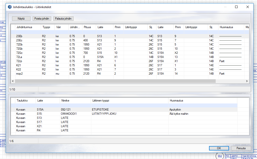 Oletuksena johdinsarjan tallennus ja taulukoiden lisäys keskeytetään mikäli liitinsymboleissa on jokin virhe. Ohjelma näyttää kuitattavassa ikkunassa virheet ja merkkaa kuvaan vihreällä virheelliset symbolit.