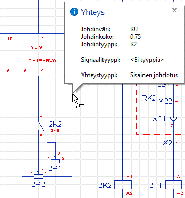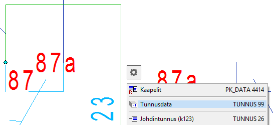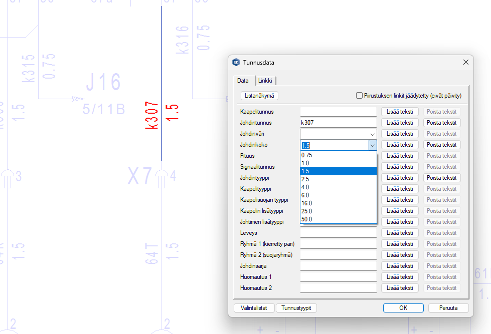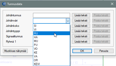 Kaikki johtimelle annettavat tiedot ovat syötettävissä uuden Tunnusdata-dialogin kautta, joka avautuu johdinvalinnan ja sen jälkeisen tilannekohtaisesta valikosta löytyvän Tunnusdata-valinnan kautta.