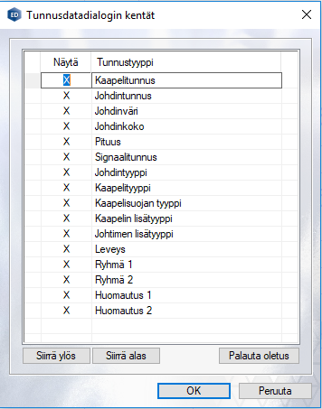 Jos joillekin oletuksena esitetyille tunnusdatan tietokentille ei ole käyttöä, tarpeettomat kentät voidaan piilottaa valitsemalla Muokkaa näkymää Tunnusdata-dialogin vasemmasta alareunasta. Myös kenttien järjestys on vapaasti säädettävissä valitsemalla Siirrä ylös tai Siirrä alas.