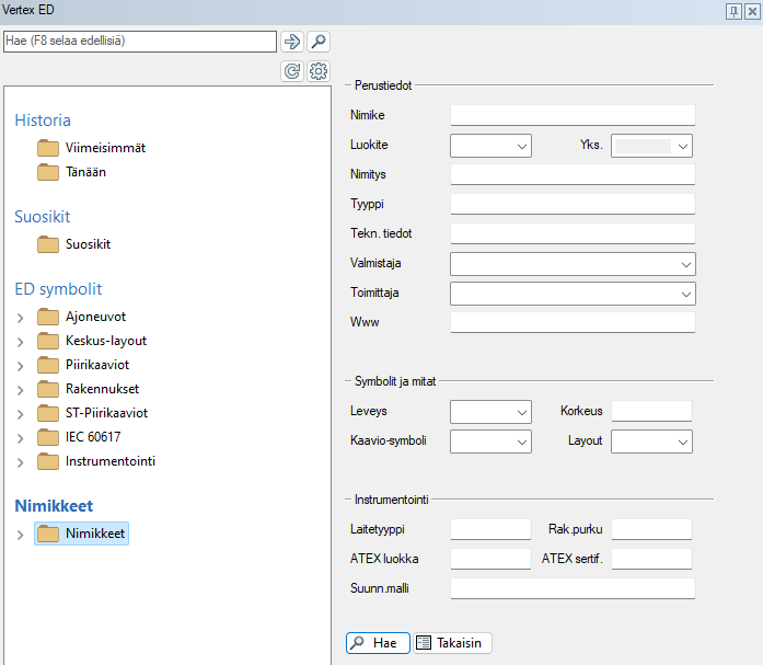 Nimikkeille voidaan määrittää symboleita, joten suunnittelu voi lähteä vaihtoehtoisesti liikkeelle symbolin valinnan lisäksi myös nimikkeen kautta. Lue lisää nimikekirjastosta ja nimikkeiden symboleista sivulta Kirjastot ja kirjastotoiminnot.