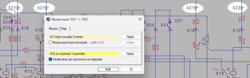 Kuvassa yritetään korjata laitetunnusta X21 → X22. Ohjelma ilmoittaa, että X21 löytyy jo 5 kertaa muualta. Lisäksi X22 löytyy jo kerran eli kyseinen tunnus on jo olemassa. Voidaan valita “Muuta myös muut tunnukset (kaikki X21 → X22) ja varoituksen aktivointi aina sen varalle, jos uusi tunnus on jo käytössä muualla.