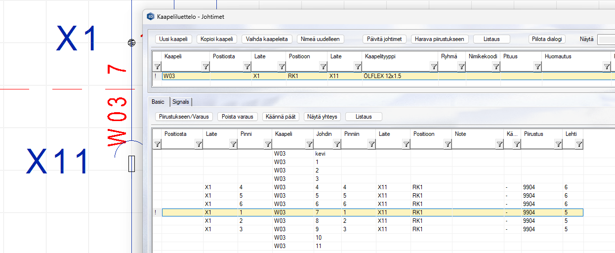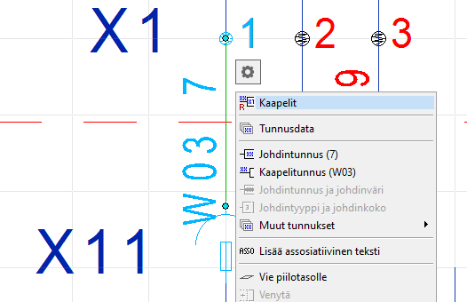 Valitaan kaapeloitu yhteysviiva, valitaan Kaapelit. Siirrytään kaapelivaraustietokantaan.