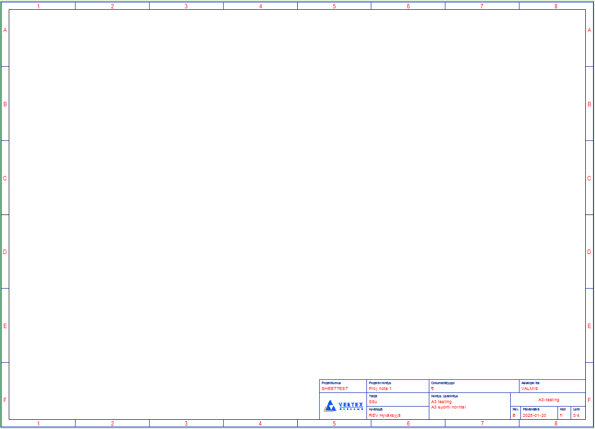 Versiosta Vertex ED 2025 (v.31.x.x) alkaen ohjelman mukana toimitetaan SFS-EN ISO 5457 ja SFS-EN ISO 7200 standardien mukaiset esimerkkipiirustuslomakkeet arkkikoissa A0, A1, A2, A3 ja A4 (pysty) sekä suomeksi että englanniksi. Piirustuslomakkeiden esimerkit on tehty standardin antamien mittojen ym. määrittelyiden mukaisesti ja lomakkeiden otsikkotaulu on esimerkki joistakin standardin pakollisiksi määritellyistä tai vapaaehtoisista kentistä. Lisäksi olemme tuoneet otsikkotauluun joitain mielestämme olennaisempia tietoja, joita käyttäjämme ovat jo totuttuun tapaan kirjailleet projektien, piirustusnumeroiden tai piirustuslehtien arkistotietokantoihin talteen vuosien saatossa ja käyttäneet aiemmissa lomakkeissaan. Standardilomakkeiden lisäksi saatavilla on myös kolmen viimeisen lehtirevision sisältämät versiot otsikkotauluista.