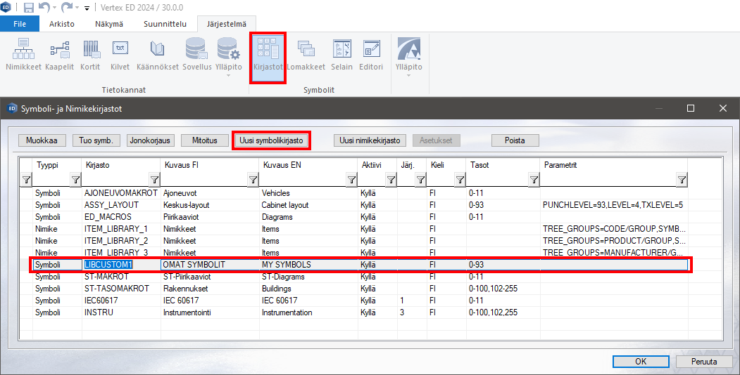 Versiosta ED 2024 (v.30) alkaen uuden symbolikirjaston voi tehdä suoraan Järjestelmä - Kirjastot valikon kautta valitsemalla Uusi symbolikirjasto. Toiminto tekee kirjastoon uuden symbolikirjaston (LIBCUSTOMn) eli uusia symbolikirjastoja syntyy LIBCUSTOM1, LIBCUSTOM2,… nimillä ja niin edelleen. Tähän uuteen symbolikirjastoon voidaan tuoda symboleja muista kirjastoista Tuo symb. -valinnan kautta ja kirjaston sisältöä ja symbolien ominaisuuksia pystytään muokkaamaan normaaliin tapaan Muokkaa-valinnan kautta.