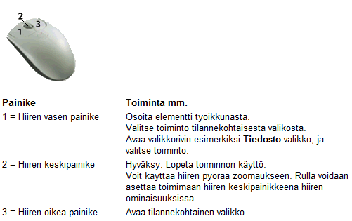 Piirtotyön tueksi saatat tarvita neuvoja hiirityöskentelyyn ja pikanäppäinten käyttöön. Vertex ED:ssä hiirellä suoritetaan erilaisia piirtämiseen tai muuhun toimintoon liittyviä valintoja. Hiirellä suoritetaan myös piirustuksen zoomaukseen ja siirtelyyn liittyviä toimintoja.