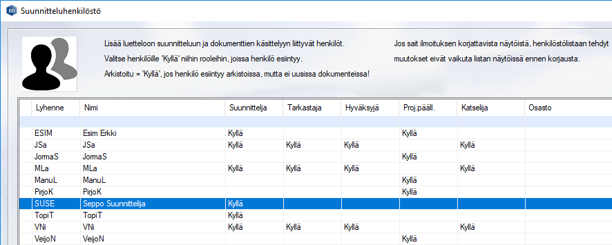 Edellytyksenä tempun tekemiselle on, että olette onnistuneesti käyttöönottaneet Vertex ED:n Suunnitteluhenkilöstö-toiminnon näyttöjen korjauksineen ja henkilöstölistojen täydentämisineen. Tässä esimerkissä suunnittelija ja projektipäällikkö Seppo Suunnittelija (Lyhenne SUSE) on lisätty ja tallennettu Suunnitteluhenkilöstö-toiminnon kautta. Nyt Seppo Suunnittelija haluaa, että hänen nimensä ja suunnittelijatunnuksensa (lyhenne) "SUSE" löytyy aina esimerkiksi vastuuhenkilöstölistan kärjestä valintojen nopeuttamiseksi.