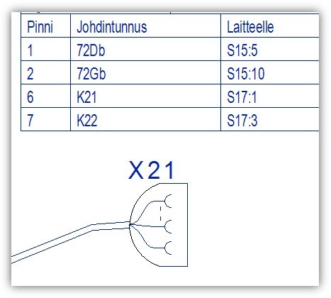 Kaavion liitinpinni –symboleihin lisätään tieto uros- ja naaras –pinnin roolista. Toisinaan liittimen pinnien välille tehdään siltauksia.