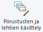 Piirustusten ja lehtien käsittely -toiminnon näkymä näyttää kootusti kaikki projektiin liittyvät piirustukset ja piirustuslehdet samassa taulukkonäkymässä. Toiminnon avulla voit esimerkiksi poistaa turhia projektiin kuuluvia piirustuksia, vaihtaa piirustusten numeroita sekä muokata piirustuslehtien numerointia ja järjestystä.