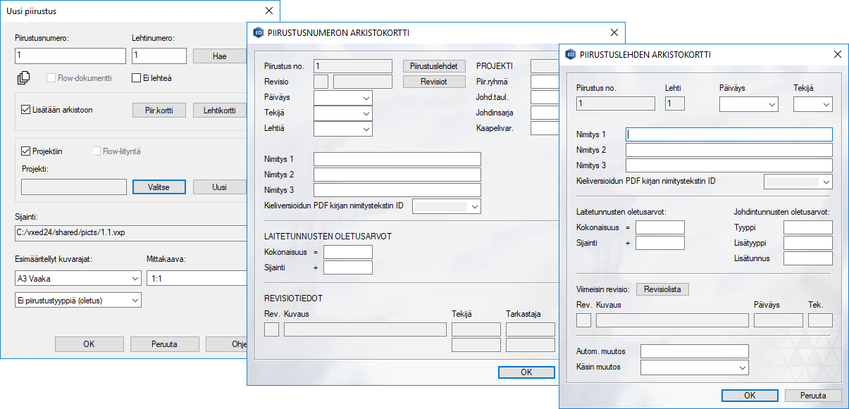 Perustat uuden piirustuksen tai piirustuslehden piirustustoimintojen Uusi-toiminnon kautta. Piirustukseen kuuluu aina yksi tai useampi piirustuslehti (sivu), joille on annettava numero niitä perustettaessa. Numeroinnin apuna voit käyttää ohjelman omaa numerointiautomaattia (Hae-toiminto), joka sarjoittaa perustettavien piirustusten ja piirustuslehtien numeroinnin automaattisesti erikseen määriteltävien asetusten mukaisesti. Voit valita lisätäänkö piirustus tekovaiheessa arkistoon ja halutessasi voit yhdistää perustettavan piirustuksen johonkin jo olemassa olevaan, arkistosta löytyvään projektiin.