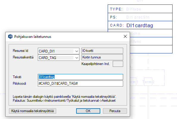 Kytkentöjen lisäsi pohjakuva sisältää piirtotavasta riippuen suuren määrän viittauksia varattuihin resursseihin. Pohjakuvan tietokantaviittauksiin on käytettävissä avustava dialogi, joka aktivoidaan työkaluvalikon asetukset välilehdeltä. Dialogia käytetään kaiken tyyppisten tekstien/tunnusten syöttöön kuvassa. Pitää kuitenkin muistaa tunnusten parametristen dialogien yleinen asetus (näppäinyhdistelmä <välilyönti>+P), joka aktivoi/kytkee pois myös pohjakuvien dialogin.