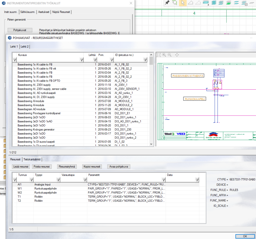 Työkaluvalikosta pääsee katsomaan ja muokkaamaan resurssimäärittelyjä kaikkiin projektin pohjakuviin.