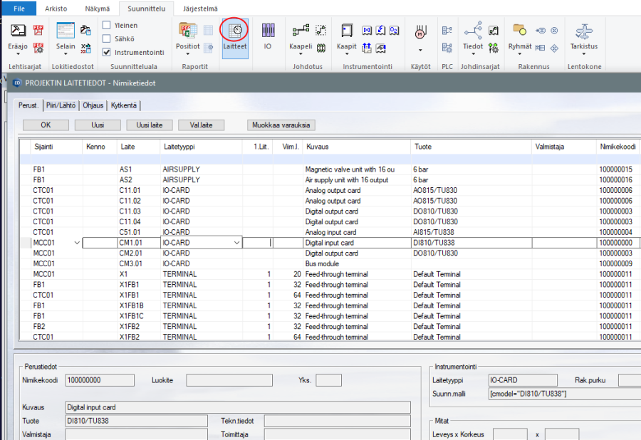 Generoinnissa laiteluetteloon kertyvät generoiduissa piireissä ja lähdöissä esitellyt laitteet: esim. instrumentit ja sähkökäyttöjen peruskomponentit.