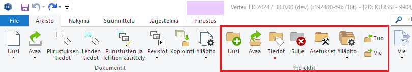 Vertex ED:n projektien käsittelyn toiminnot löytyvät ohjelman Arkistot-välilehdeltä kohdasta Projektit.