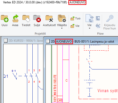 Eri projekteihin kuuluvien dokumenttien ikkunaa vaihtamalla työstettävän projektin tunnus vaihtuu ohjelmaikkunan yläpalkkiin. Näin voit pitää huolen ja tarkistaa, että työstät varmasti oikeaan projektiin kuuluvaa dokumenttia.