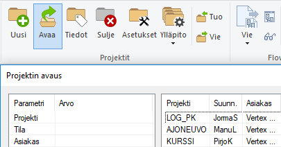 Vertex ED:ssä projekteja voi olla aktiivisena yksi projekti kerrallaan. Projektit avataan ja aktivoidaan projektitoimintojen Avaa-toiminnon kautta ja suljetaan valitsemalla Sulje.