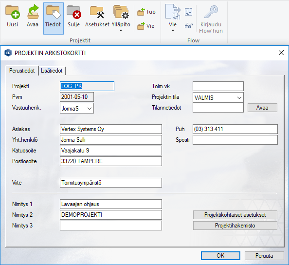 Voit tarkastella ja muuttaa aktiiviseen projektiin liittyviä tietoja projektitoimintojen Tiedot-toiminnon avulla. Toiminto avaa jo projektin perustamisvaiheestakin tutun projektikohtaisen arkistokortin, jonka tiedot ovat vapaasti tarkasteltavissa ja muokattavissa.