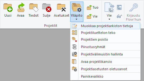 Projektien ylläpitotoimintojen avulla hallitset esimerkiksi projektiasetusten oletusarvoja, piirustusryhmiä, projektiluetteloita sekä projektiarkiston tietoja.